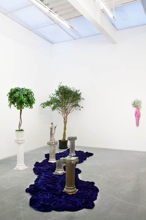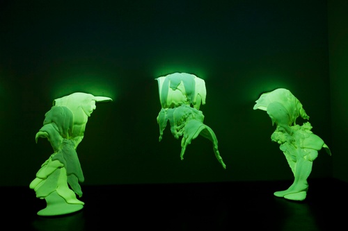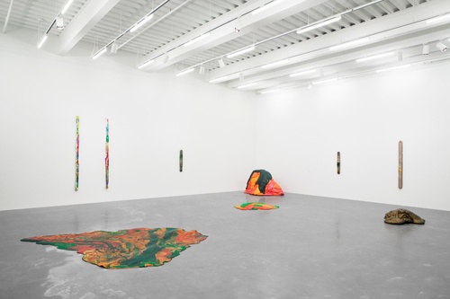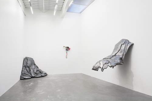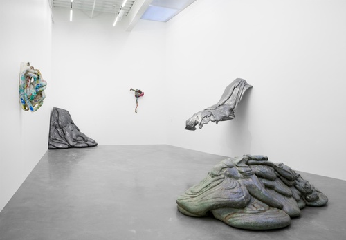 The current exhibition, the artist’s first retrospective in New York and first in twenty years, spans the range of Benglis’s career including her early wax paintings, her brightly colored poured latex works, the “Torsos” and “Knots” series from the 1970s, and her recent experiments with plastics, cast glass, paper, and gold leaf. It features a number of rarely exhibited historic works including Phantom (1971), a dramatic polyurethane installation consisting of five monumental sculptures that glow in the dark, and the installation Primary Structures (Paula’s Props), first shown in 1975. Alongside her sculptural output, Benglis created a radical body of work in video, photography, and media interventions that explore notions of power, gender relations, and role-playing. These works function in tandem with her sculpture to offer a pointed critique of sculptural machisimo and suggest a fluid awareness of gender and artistic identity. They also contribute to an understanding of the artist’s objects as simultaneously temporal and physically present, intuitive and psychologically charged.