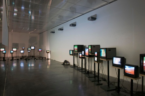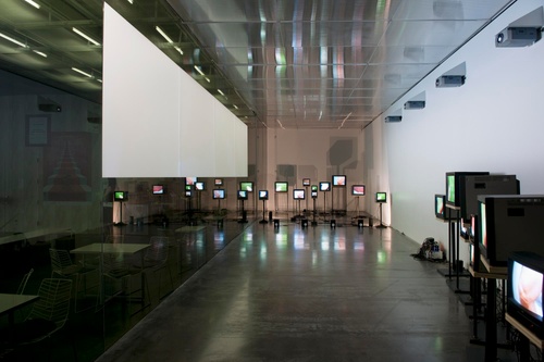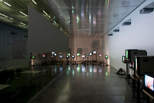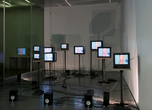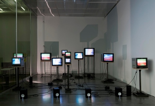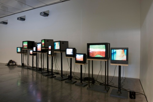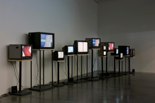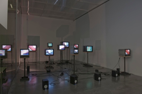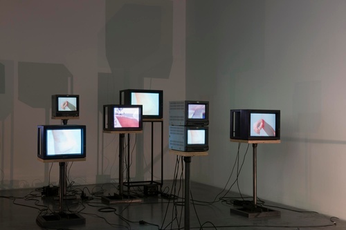 Atlas’s multimedia installation Joints Array explores time-based portraiture, the body, fragmentation, and movement: all subjects the artist has engaged for much of his work. The central four videos of the installation show early experimental footage of legendary dancer and choreographer Merce Cunningham. Atlas began working for Cunningham in the early 1970s and collaborated with him on films and videos from 1974 to 1983. During that time, Atlas invented the term “mediadance” to define the art of dance conceived specifically for film or video, an area in which he and Cunningham were pioneers. On the occasion of Cunningham’s death in 2009, Atlas revisited his earliest films of the dancer. Recorded during a break from rehearsals, the footage is comprised of close-up shots of Cunningham’s wrist, elbow, ankle, and knee, capturing his unique style of movement. The soundtrack features unpublished ambient recordings by Cunningham’s life partner, the avant-garde composer John Cage. In Atlas’s installation, this urban noise becomes a chance accompaniment to the dancer’s movement in a manner that honors the music Cage provided for many of Cunningham’s dances. A fractured portrait of motion and form, varying in tempo and scale, Joints Array transforms a casual interaction between dancer and filmmaker into a vivid performance of personal and cultural significance.