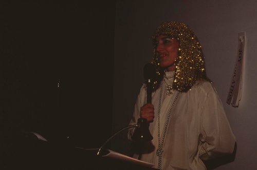 For 1990-91—the seventh and final year of the project—Montano’s focus is on bliss; the chakra is centered on top of the head. The color that she wears and is surrounded by is white, the tone she listens to is F, and her accent is, for the first time in the performance, her own.”1