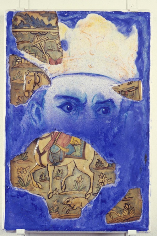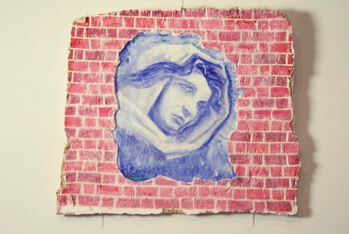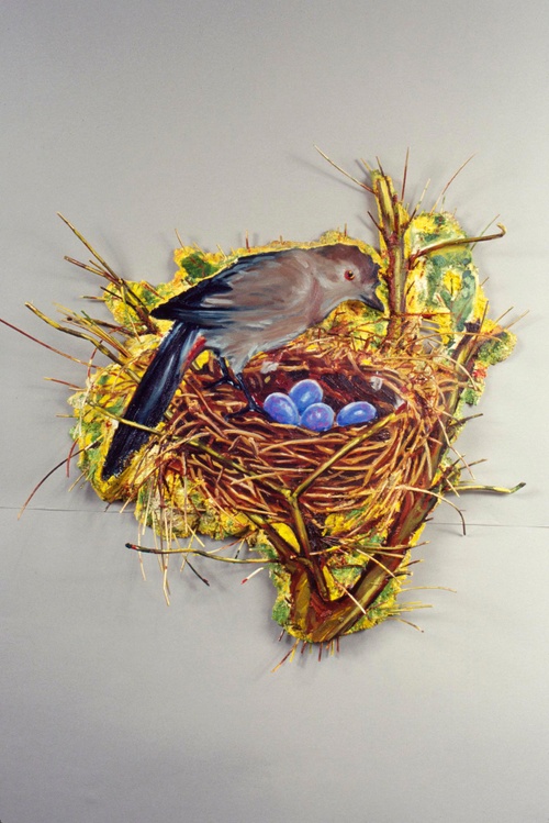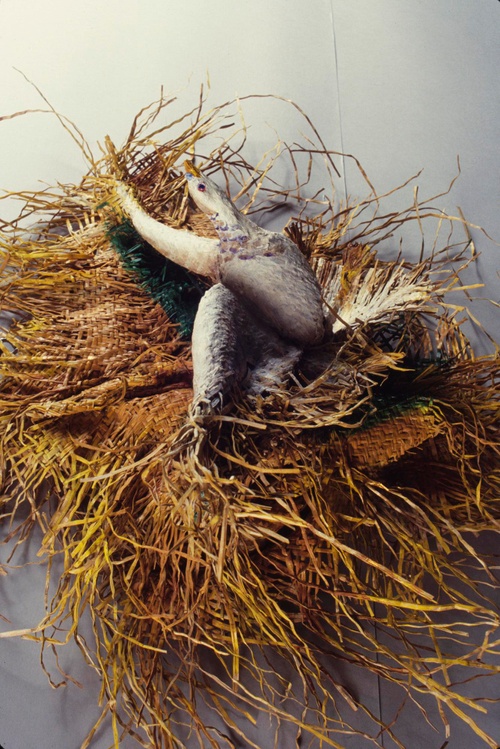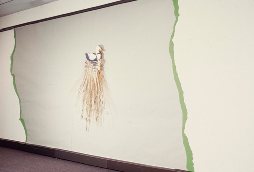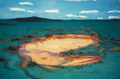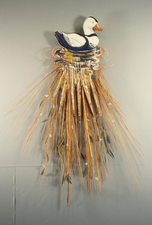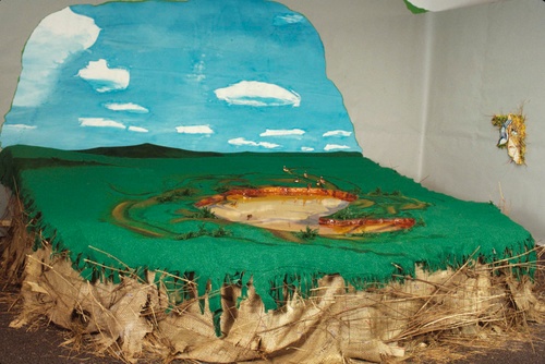 As part of the larger exhibition, “In A Pictorial Framework,” David Saunders presented his installation piece Scope, a contemporary version of a pastoral scene, in which real components mingled with artificial ones. Hay and leaves literally and figuratively constituted the ground. Live fish and plants encompass a figure which represented life, a Lady Bountiful, painted on the underside of an artificial pond in the middle of the installation. The image was inspired by the water nymph, a traditional character in Celtic myths. In spirit, Scope was reminiscent of the playfulness of Shakespeare’s Midsummer Night’s Dream.