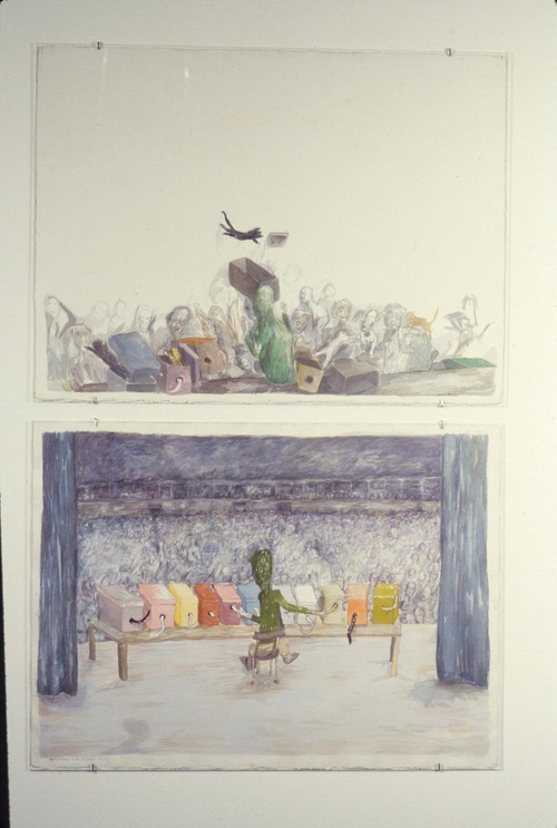 As part of the larger exhibition, “In A Pictorial Framework,” Finley Fryer presented his installation The Cat Band, a work that had begun two years earlier with drawings and watercolors of The Cat Organ. Some of the watercolors started to look three dimensional, thus necessitating