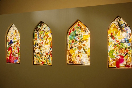 Different facets of Fryer’s life directly entered the work. He was introduced to stained glass techniques when he got a job restoring church windows. The contrast of spending most of his time in churches, and then entering the “real” world, presented extremes which affected his work. The relationship between the band and the windows was one of separate yet supportive entities. As a whole, the piece formed a structured madness far removed from the mundane necessities of an outside world.