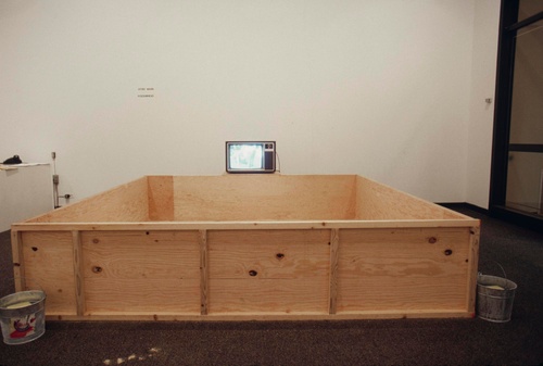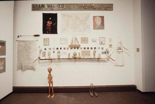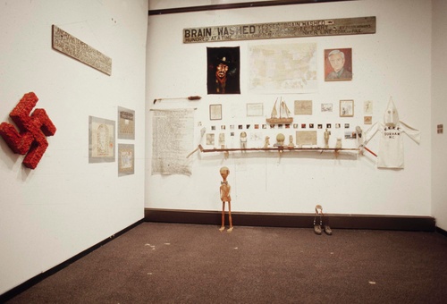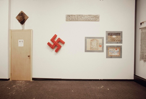 The other half of the Possumhead installation related directly to the artist’s personal life and drew from autobiographical sources. Some of the photographs and assorted paraphernalia related to dogfighting, while others were records of people, places and events in the artist’s life. Still others were simply evidence of Mann’s own black humor and fascination with things which menace, threaten and intimidate: the bizarre, the mystical, the violent. A videotape featured in the installation documented a two and half hour dogfight which took place in Commanche, Oklahoma. The artist has been fascinated by this illegal sport and kept several pit bull terriers of his own, training them and entering them in matches across the country.