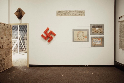 As part of the larger exhibition, “In A Pictorial Framework,” Story Mann presented his installation Possumhead. In his piece for the New Museum, Mann divided his space into two separate arenas.