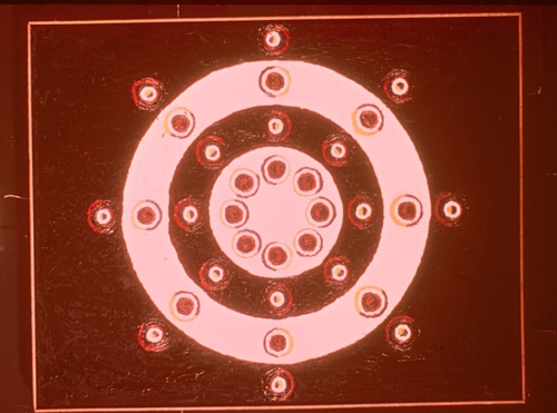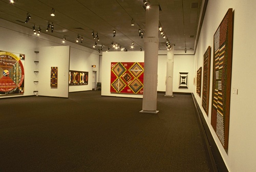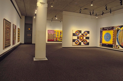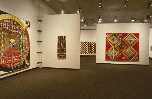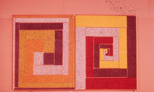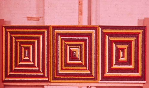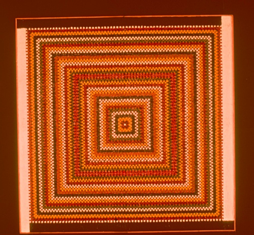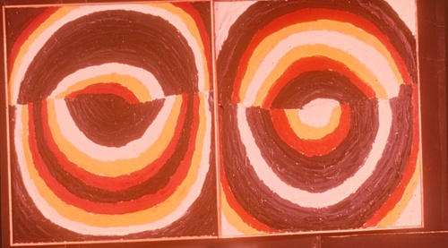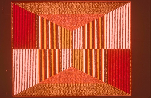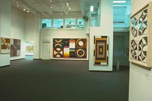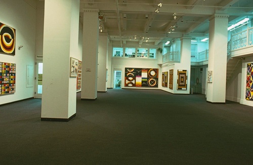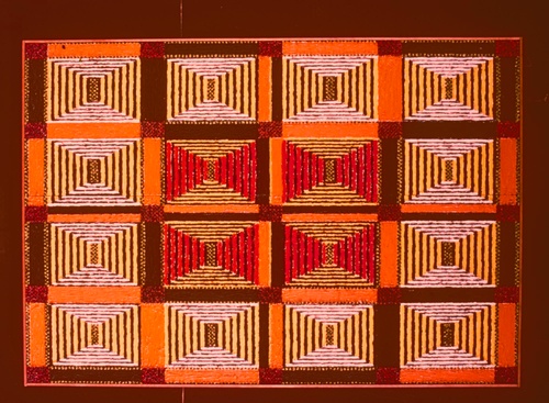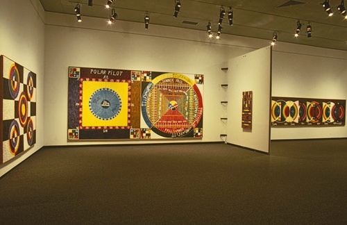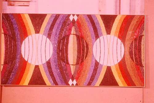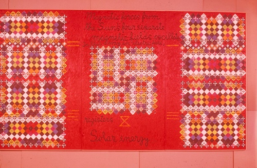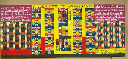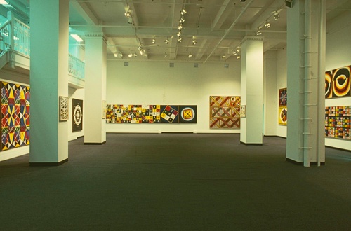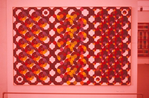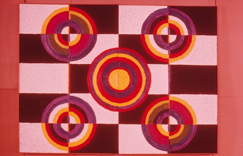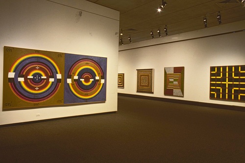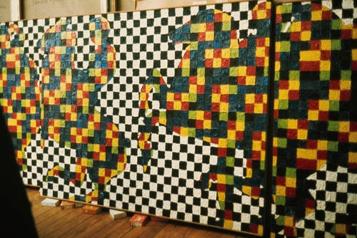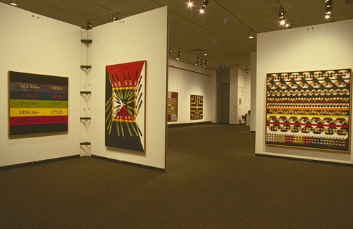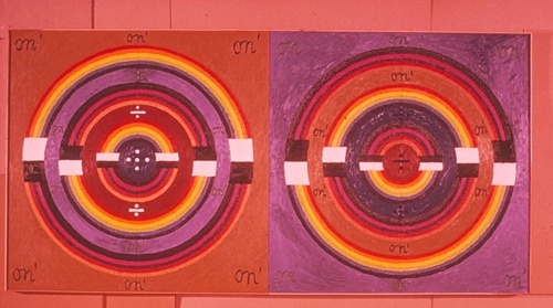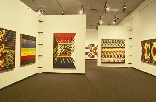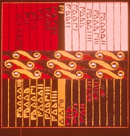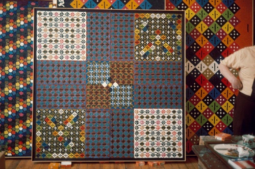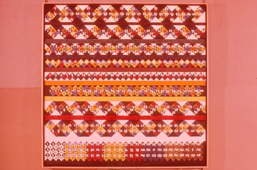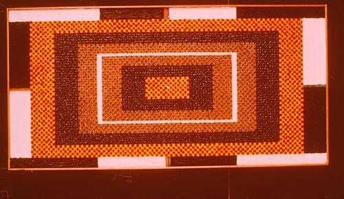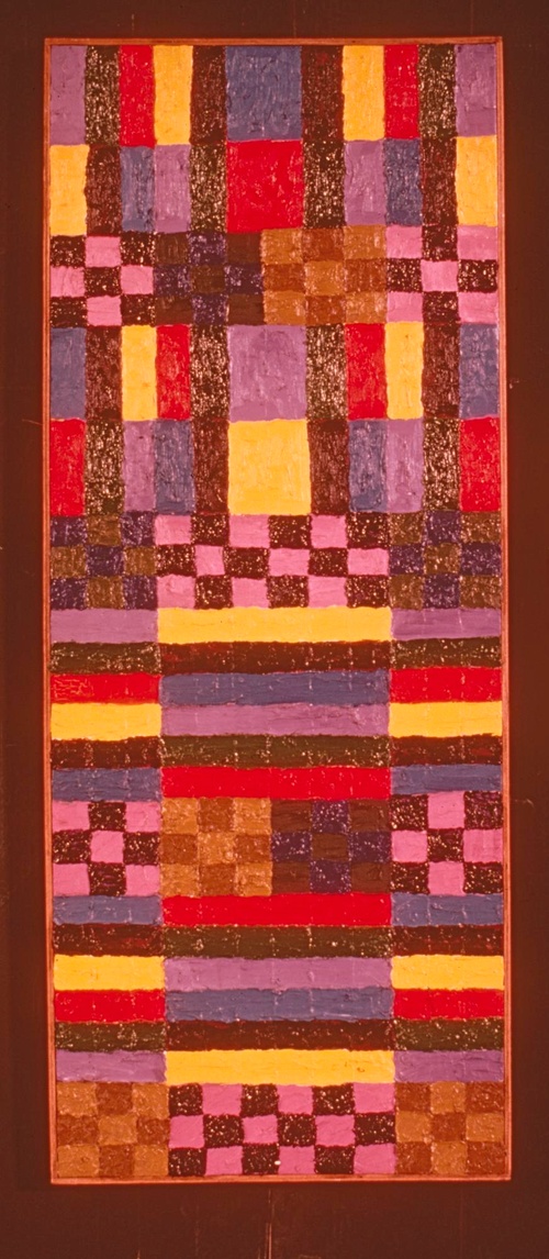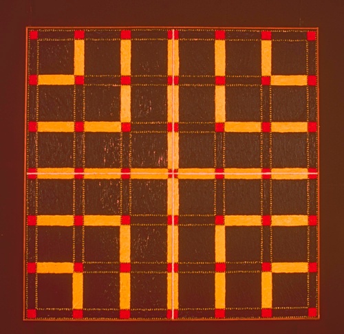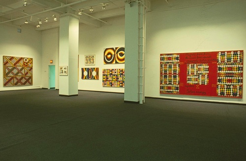 In her essay for the exhibition catalogue, Marcia Tucker describes Jensen’s work as ‘flat, thickly painted checkerboards of bright color, numbered or bordered with obscure scientific symbols or equations, bands of lush, heavy color, geometries and patterns that are somehow familiar, classical,’ calling to mind ‘Persian rugs, gameboards, tiled floors, Tantric diagrams, illuminated manuscripts and medieval stained-glass windows.’