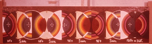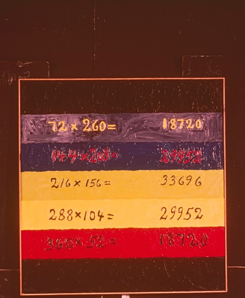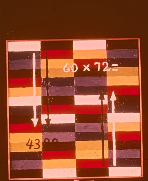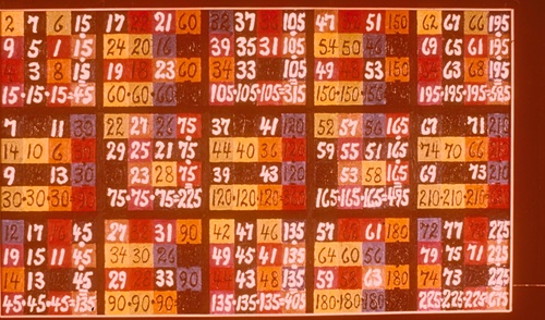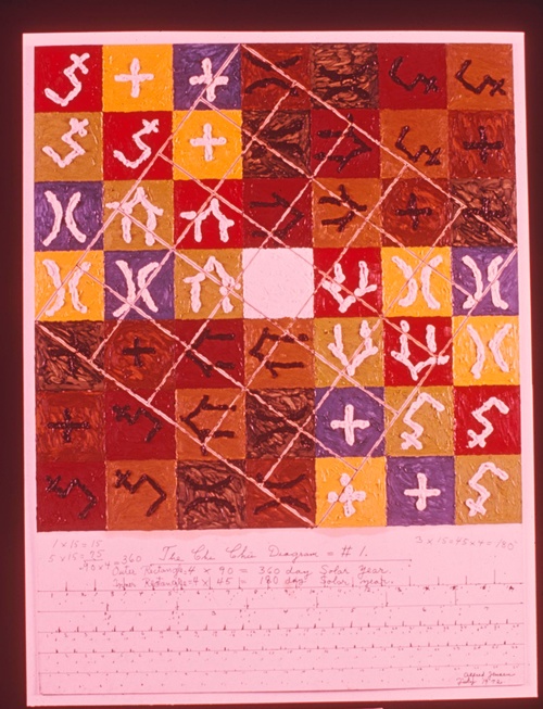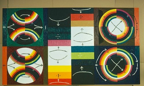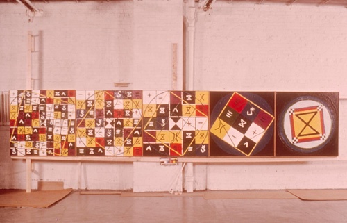 “I use multiplication, addition and subtraction in painting a picture. I use this method because the square gives me the means of setting boundaries. I find in the square specific settings, divisible areas, number structures, possibilities of time measure and rhythm as well as the essential form of color which can be placed in the square to interplay with number forms. My daughter Anna said, ‘You make different things the same.’” - Alfred Jensen, quoted in Alfred Jensen (Buffalo: The Buffalo Fine Arts Academy, 1978).